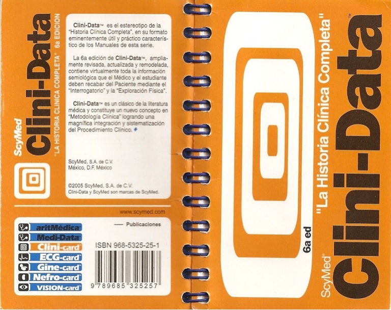 Es un estereotipo de la historia clínica completa, en su formato eminentemente útil y practico característico de los manuales de esta serie. Ampliamente revisada, actualizada y remodelada contiene virtualmente toda la información semiológica que el médico y el estúdiate deben recabar del paciente mediante el interrogatorio y la exploración físicaClini-Data es un clásico de la literatura médica y constituye un nuevo concepto en metodología clínica logrando una magnifica integración y sistematización del procedimiento clínico.