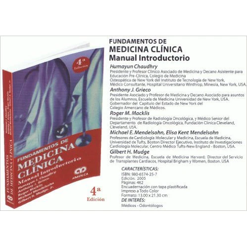 | Parte I: El ambiente hospitalario Capítulo 1. Introducción y orientación Capítulo 2. La sala de hospitalización y la clínica de consulta externa Capítulo 3. Gestión de cuidados médicos y ayuda médica Capítulo 4. Errores profesionales y médicos Parte II: El estudio médico Capítulo 5. Haciendo la historia Capítulo 6. El examen médico: una perspectiva Capítulo 7. El examen físico anotado Capítulo 8. Historia y examen físico pediátrico Capítulo 9. Bioestadística y resultados de laboratorio Capítulo 10. Pruebas hematológicas Capítulo 11. Pruebas de química sanguínea Capítulo 12. Uroanálisis Capítulo 13. Electrocardiografía Capítulo 14. Radiología de tórax, abdomen y cabeza Capítulo 15. Gasometría arterial y trastornos ácido-base Capítulo 16. La descripción médica y las notas evolutivas Capítulo 17. Presentación de casos médicos Parte III: Revisión fisiopatológica de enfermedades Capítulo 18. Enfermedades pulmonares Capítulo 19. Enfermedades cardiovasculares: enfermedad isquémica cardíaca, angina pectoris e infarto al miocardio Capítulo 20. Enfermedades gastrointestinales Capítulo 21. Enfermedades genitourinarias Capítulo 22. Enfermedades musculoesqueléticas Capítulo 23. Enfermedades neurológicas Capítulo 24. Enfermedades endocrinas Capítulo 25. Enfermedades hematológicas Capítulo 26. Tumores sólidos Capítulo 27. Enfermedad hiv y aids Parte IV: Medicina alternativa y complementaria Capítulo 28. Terapias cam tradicionales y basadas en la evidencia Parte V: Apéndices |