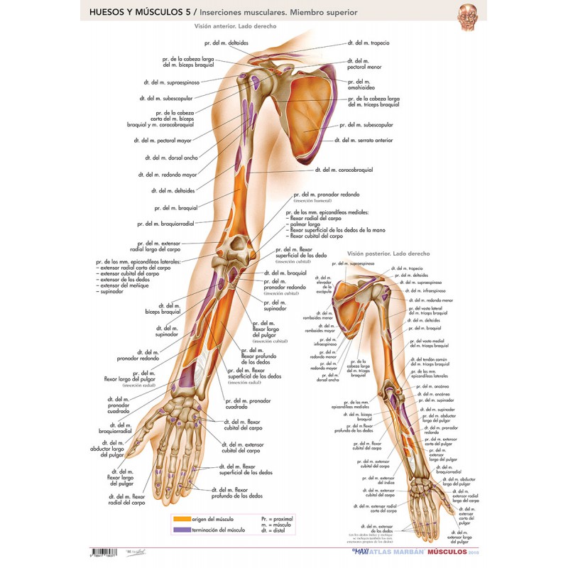 En ella se puede ver diferenciada tanto la visión anterior como posterior del lado derecho del miembro superior, señalando con colores los orígenes e inserciones musculares.