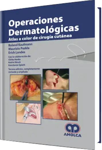 | I: Parte general 1: Propedéutica de la dermatología quirúrgica 1.1: Condiciones previas para realizar operaciones dermatológicas Generalidades Equipamento de la sala de operación Construcción Inventario Esterilización 1.2: Aspectos preoperatorios Generalidades Anamnesis Declaración de consentimiento por parte del paciente Preparación para la operación Informe de la operación 1.3: Anestesia cutánea Generalidades Premedicación Procedimiento de anestesia tópica Anestesia por infiltración Bloqueo de conducción Anestesia local tumescente 1.4: Instrumentos de la dermatología quirúrgica Generalidades Instrumentos importantes para pequeñas intervenciones y escisiones Dermátomos Aparatos para hacer abrasiones cutáneas Instrumentos electroquirúrgicos Láser Duración de la aplicación y densidad de potencia: láser de onda continua vs. láser pulsado Importancia de la longitud de onda y del estado del tejido Sistemas de rayos láser el rango de los rayos ultravioleta Sistemas láser en el rango visible Láser de argón Láser KTP Láser de colorante Láser de rubí Láser Alejandrita Láser de diodo Sistemas de láser en el rango de los rayos infrarrojos Láser Neodimio – YAG Láser de CO2 Láser Erbio: YAG 1.5: Hemostasia Generalidades Medidas prácticas de apoyo Vasoconstrictores Ligadura y pericentesis Electrocoagulación Hemostípticos tópicos 1.6: Sutura quirúrgica Observaciones preliminares Materiales de sutura Material de sutura reabsorbibles Materiales de sutura no reabsorbibles Tipos de agujas Erinas Emplastos para cicatrización y películas de poliuretano Adhesivos cutáneos Técnicas de sutura Remoción de los puntos de sutura Probabilidades de errores y complicaciones Cuidados postoperatorios 1.7: Bibliografía 2: Técnicas estándares en la dermatología quirúrgica 2.1: Introducción 2.2: Curetaje, afeitado cutáneo, corte con tijeras y exéresis con asa Observación preliminar Curetaje Afeitado cutáneo Corte con tijeras, exéresis con asa 2.3: Escisiones Observaciones preliminares Elección de los límites de la escisión Cirugía controlada microscópicamente Escisiones por punción Escisiones en forma elipsoidal Escisiones en serie Expansor cutáneo 2.4: Procedimientos biósticos Observaciones preliminares Técnicas de rutina Procedimientos especiales Biopsia ungueal Biosia del rodete un ungueal Biopsia del lecho ungueal Biopsia de la matriz ungueal Biopsia ungueal lateral longitudinal Biopsia muscular Biopsia de la arteria temporal Linfadenectomía de diagnóstico Biopsia testicular Generalidades Indicaciones especiales Instrumentos Anestesia Técnica Cuidados postoperatorios 2.5: Técnicas abrasivas Observaciones preliminares Dermabrasión Indicaciones Anestesia Instrumentos especiales Técnicas Cuidados postoperatorios Abrasión manual con cepillos Generalidades Anestesia Instrumentos Técnica Cuidados postoperatorios 2.6: Procedimientos eletroquirúrgicos Observaciones preliminares Instrumentos especiales Técnicas Electrocauterización Electrofulguración y electrodesecación Electrocoagulación Electrotomía 2.7: Procedimientos quirúrgicos con láser Observaciones preliminares Instrumentos Anestesia Técnicas e indicaciones Láser para tratamiento de lesiones vasculares Sistemas que producen coagulación a nivel superficial Sistemas que producen coagulación a nivel profundo Fototermólisis selectiva Láser para tratamiento de lesiones pigmentadas Fototermólisis selectiva de pigmentos Remoción de lesiones pigmentadas Láser para corte y extirpación cutánea Láser de CO2 Láser Erbium-YAG Indicaciones para la extirpación cutánea por láser Cuidados postoperatorios 2.8: Procedimiento de injerto cutáneo Generalidades Transplantes libres Observaciones preliminares Injerto dermoepidérmico Generalidades Instrumentos Técnicas estándar de la transferencia del injerto dermoepidérmico Técnicas del injerto en malla (Meshgraft-Technik) Atención postoperatoria Transplante cutáneo completo Generalidades Técnica Cuidados postoperatorios 2.9: Autoplastia de colgajos cercanos Observaciones preliminares Colgajo en acordeón y por deslizamiento Generalidades Técnicas y posibilidades de aplicación Rotaciones y deslizamientos por rotaciones Generalidades Técnicas y posibilidades de aplicación Procedimientos de transposición Generalidades Técnicas y posibilidades de aplicación 2.10: Bibliografía II Parte especial 3: Técnicas de escisión y reparación de defectos en localización especiales 3.1: Región cabeza-cuello Observaciones preliminares Anatomía Zonas pilosas Generalidades Instrumentos especiales Técnicas Región temporal y zona frontal Generalidades Técnicas Mejillas, área del mentón y cuello Generalidades Técnicas Área palpebral Generalidades Anestesia Instrumentos especiales Técnicas Cuidados postoperatorios Región nasal Generalidades Técnicas Cuidados postoperatorios Labios Generalidades Anestesia Técnicas Orejas Generalidades Anestesia Técnicas Cuidados postoperatorios 3.2: Tronco Observaciones preliminares Reparación del defecto en el área torácica ventral Reparación del defecto en el área torácica dorsal Reparación del defecto en el área torácica lateral 3.3: Extremidades Observaciones preliminares Brazos y piernas Anatomía Generalidades Técnicas Manos y pies Anatomía Generalidades Técnicas 3.4: Bibliografía 4: Intervención especiales de la región anogenital 4.1 Región anal Observaciones preliminares Tratamiento de la flebotrombosis anal Generalidades Anestesia Técnica Cuidados postoperatorios Operaciones de mariscos hemorroidales Generalidades Anestesia Instrumentos Técnicas Cuidados postoperatorios Remoción de papilas analeshipertróficas (fibromas anales) Generalidades Anestesia Instrumentos especiales Técnica Cuidados postoperatorios Remoción de verruga acuminada Generalidades Anestesia Instrumentos especiales Técnicas Electrocirugía Coagulación con láser y vaporización con láser Cuida