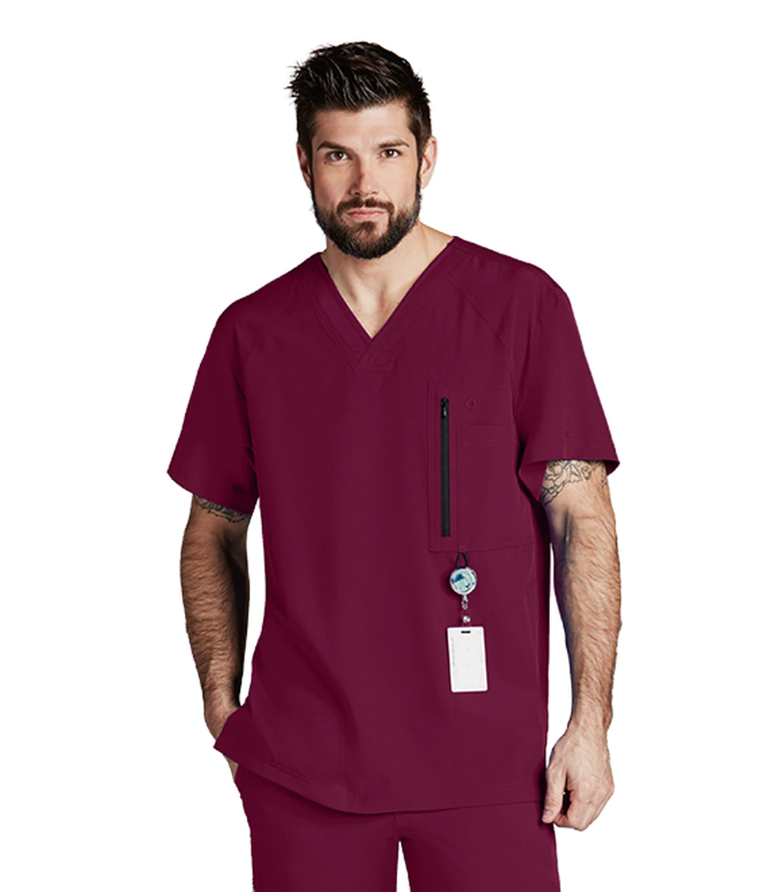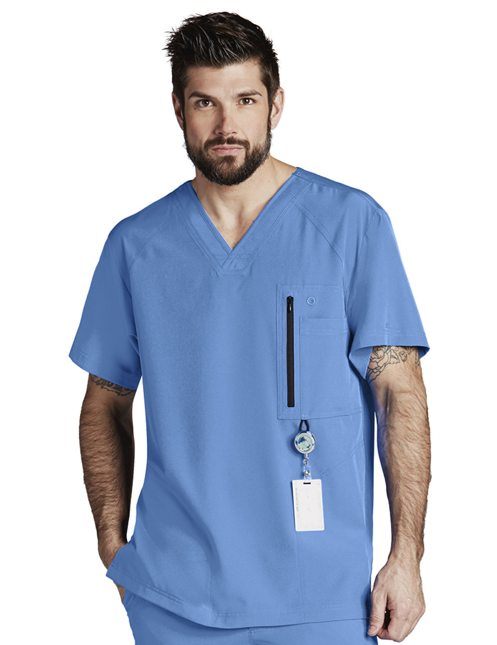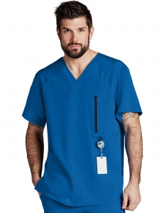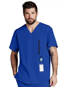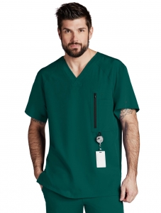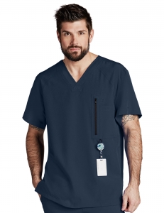 Filipina cuello en V, corte moderno. 5 bolsas (1 al frente con zipper más 1 interna, 2 a los lados ocultas más 1 integrada). 30’’