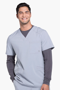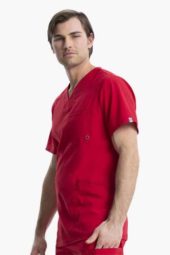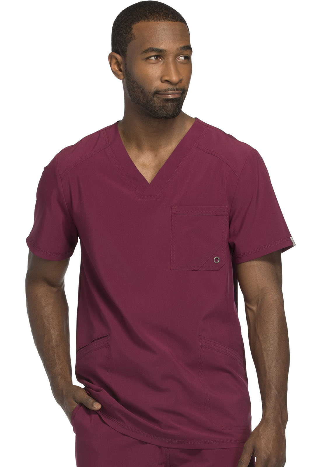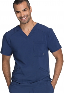 Filipina cuello V, con bolsillo en el pecho con detalle de ojal, bolsillos delanteros con con puntadas de pespunte triple, canesú delantero y trasero, cuenta con paneles traseros de punto elástico para mayor comodidad.